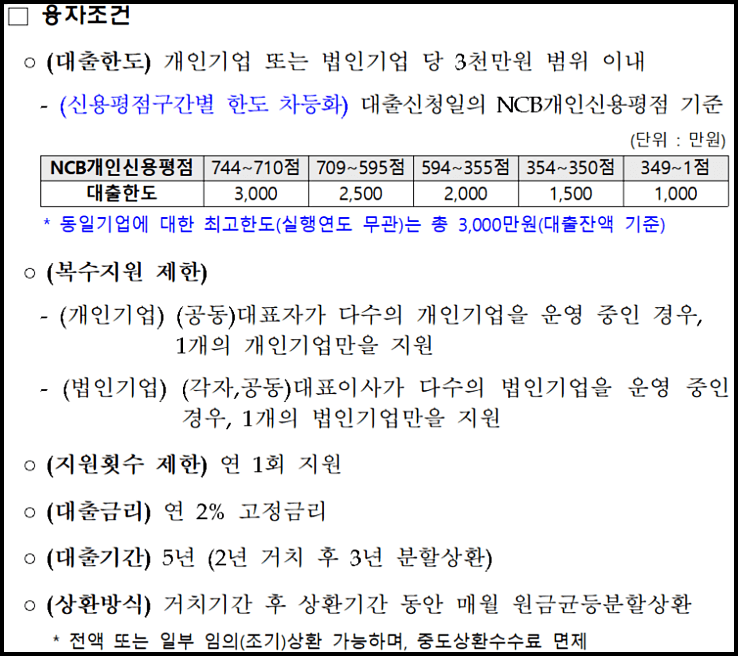 1) 대출한도 : 개인기업 또는 법인기업 당 3천만 원 범위 이내