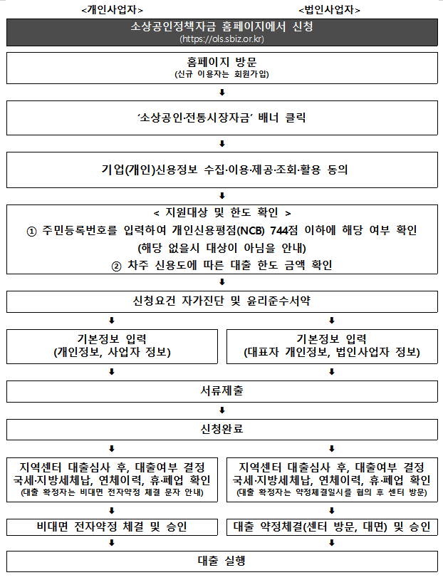 소상공인 전통시장자금대출 신청은 소상공인정책자금 누리집에서 신청하실 수 있습니다. 신청 후에는 연체, 신용점수 등 대출 제한 사유 확인 및 심사가 실시됩니다. 심사가 통과되면 약정시스템을 통해 전자약정을 체결하게 됩니다. 법인사업자는 대표이사가 지역센터를 방문해 대면약정을 체결하게 됩니다. ① 온라인 신청 : 소상공인정책자금 누리집에서 신청