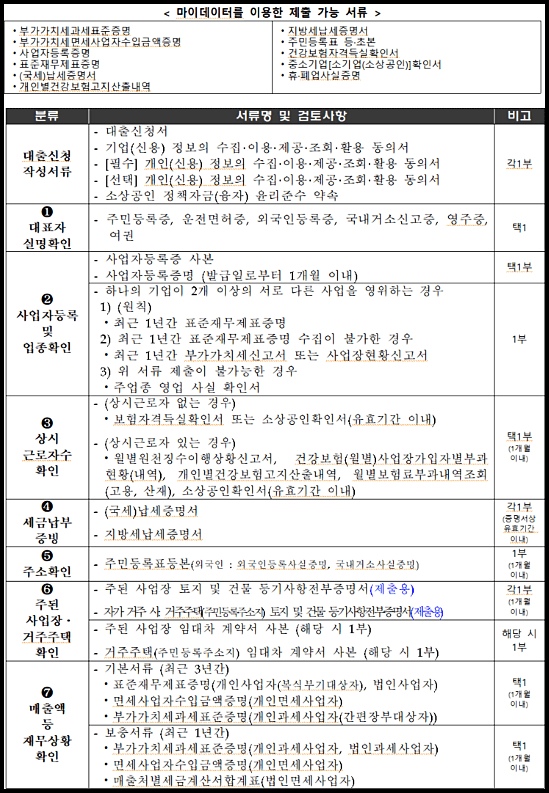 소상공인 전통시장자금대출 대출 신청에 필요한 서류는 위와 같으며, 마이데이터를 통해 서류제출을 간소화할 수 있습니다. 신청 서류는 원본 제출해야 하며, 주민번호 뒷자리 가림처리 후 제출하시면 됩니다.