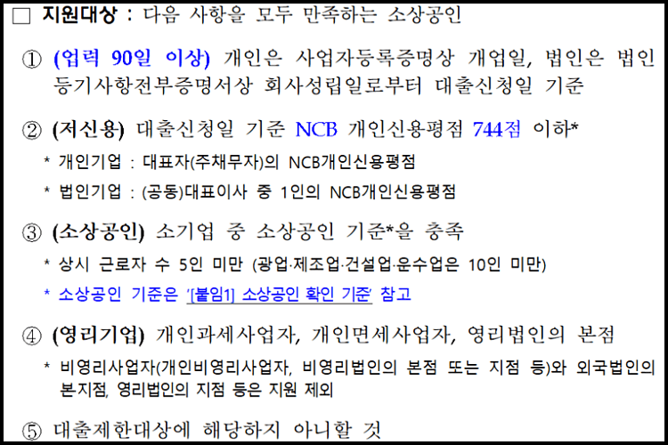 1) 업력 90일 이상 : 개인사업자는 사업자등록증명상 개업일, 법인은 법인등기사항전부증명서상 회사성립일로부터 90일 이상 지나야 신청이 가능합니다. 2) 저신용자 : 대출신청일 기준 NCB 개인신용평점 744점 이하(개인은 대표자/법인은 대표이사 중 1인)이어야 합니다. 3) 소상공인 : 소기업 중 소상공인 기준(일반적인 업종 상시 근로자 수 5인 미만)을 충족해야 합니다.