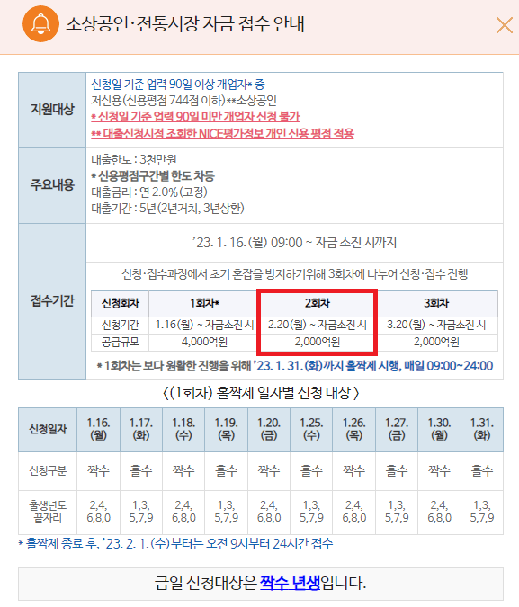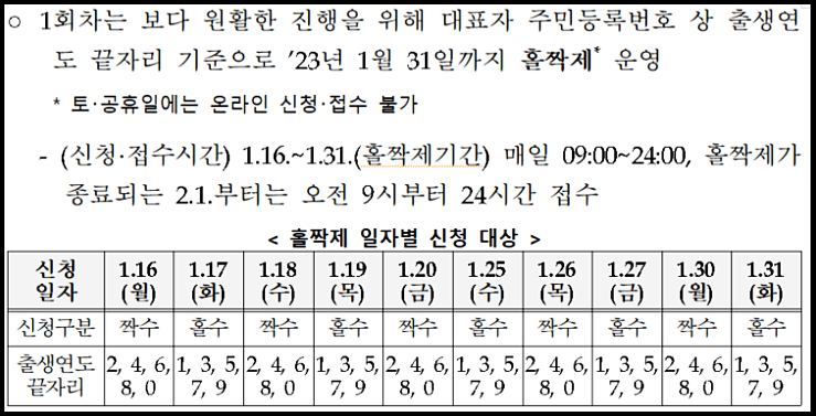신청·접수는 초기 혼잡을 방지하고자 1월 16일, 2월 20일, 3월 20일 3번에 나누어 진행하며 대표자 주민등록번호 상 출생연도 끝자리 기준으로 홀짝제 신청으로 진행합니다.