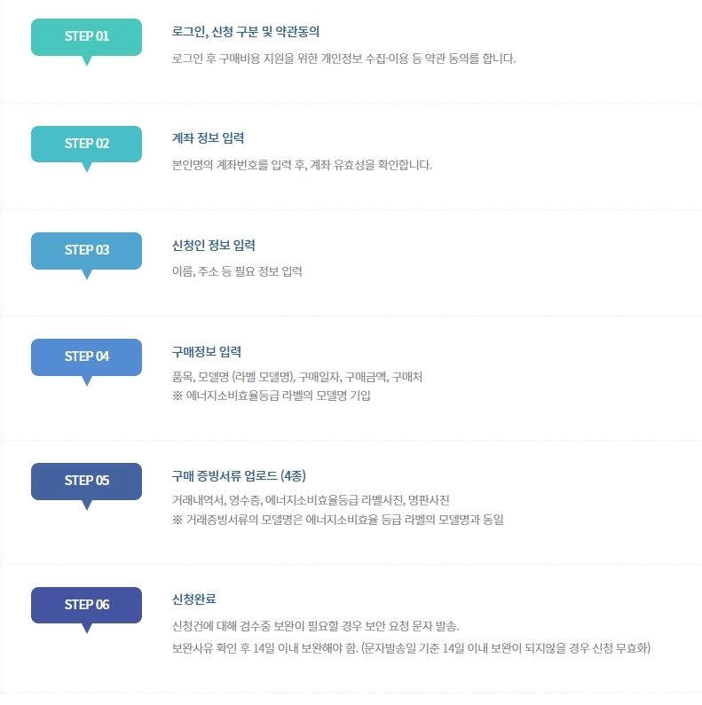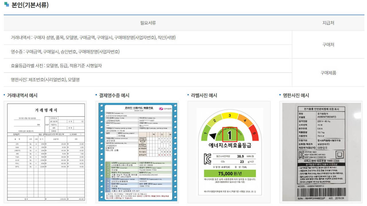 - 구매처(온라인, 오프라인) 상관없이 신청가능. 단, 반드시 에너지 소비효율등급 라벨이 있어야 함